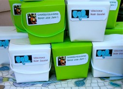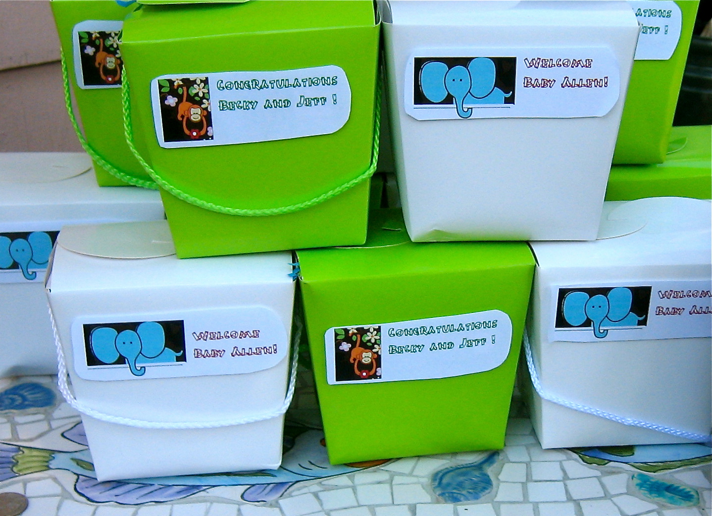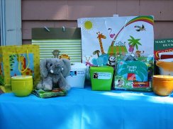 Animal Crackers were distributed in color coordinated, take out boxes. Gifts and other decor items were displayed on the gift table.