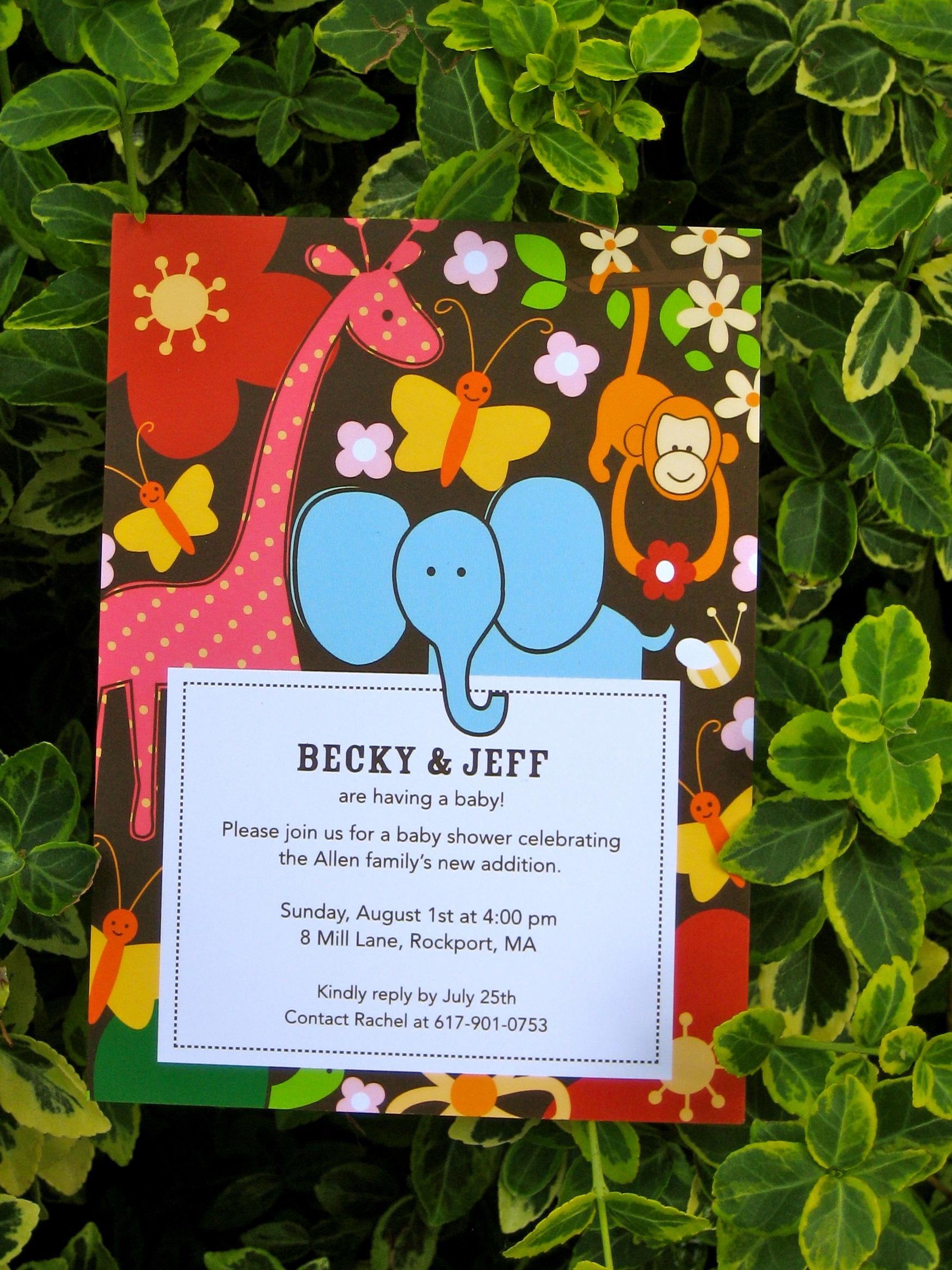 Jungle themed invitations were ordered from Tiny Prints. I can’t say enough about Tiny Prints and their vast selection of invitations, announcement and holiday card designs. I definitely recommend!