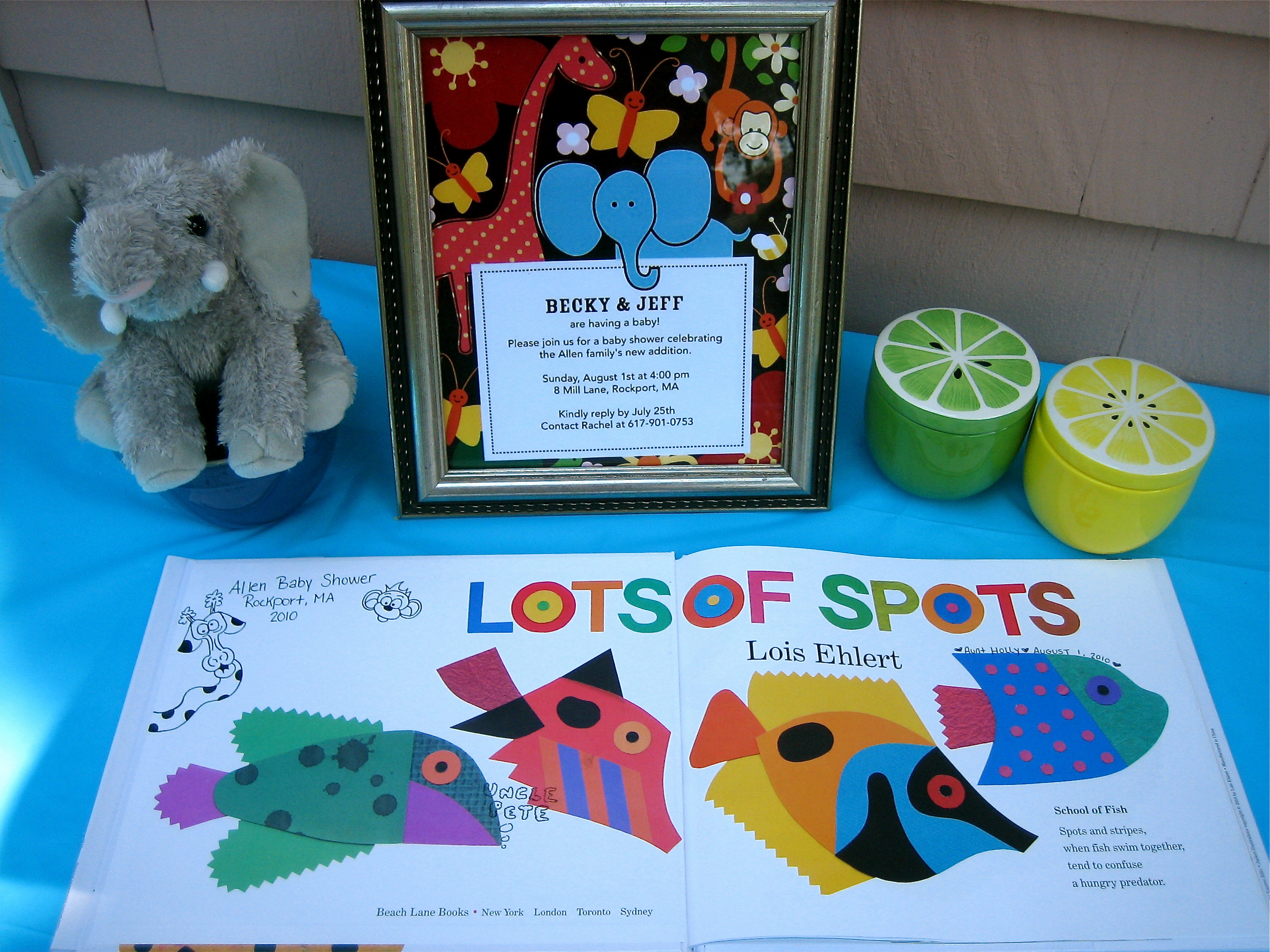 In addition to a gift, guests were asked to bring along a “Jungle and/or Animal” themed books. The book collection became a great start for Silas’s library and included classics like Curious George and Make Way for Ducklings. Upon arrival guests were also asked to sign a hardback copy of LOTS OF SPOTS as future keepsake for Silas.