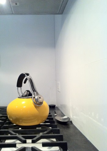 • The Kitchen – A Viking 6 burner gas white  cook top, grey concrete counter tops and one yellow tea-pot (that helped us brew a few rounds of tea that were a great accent to warm and laughter filled conversation)