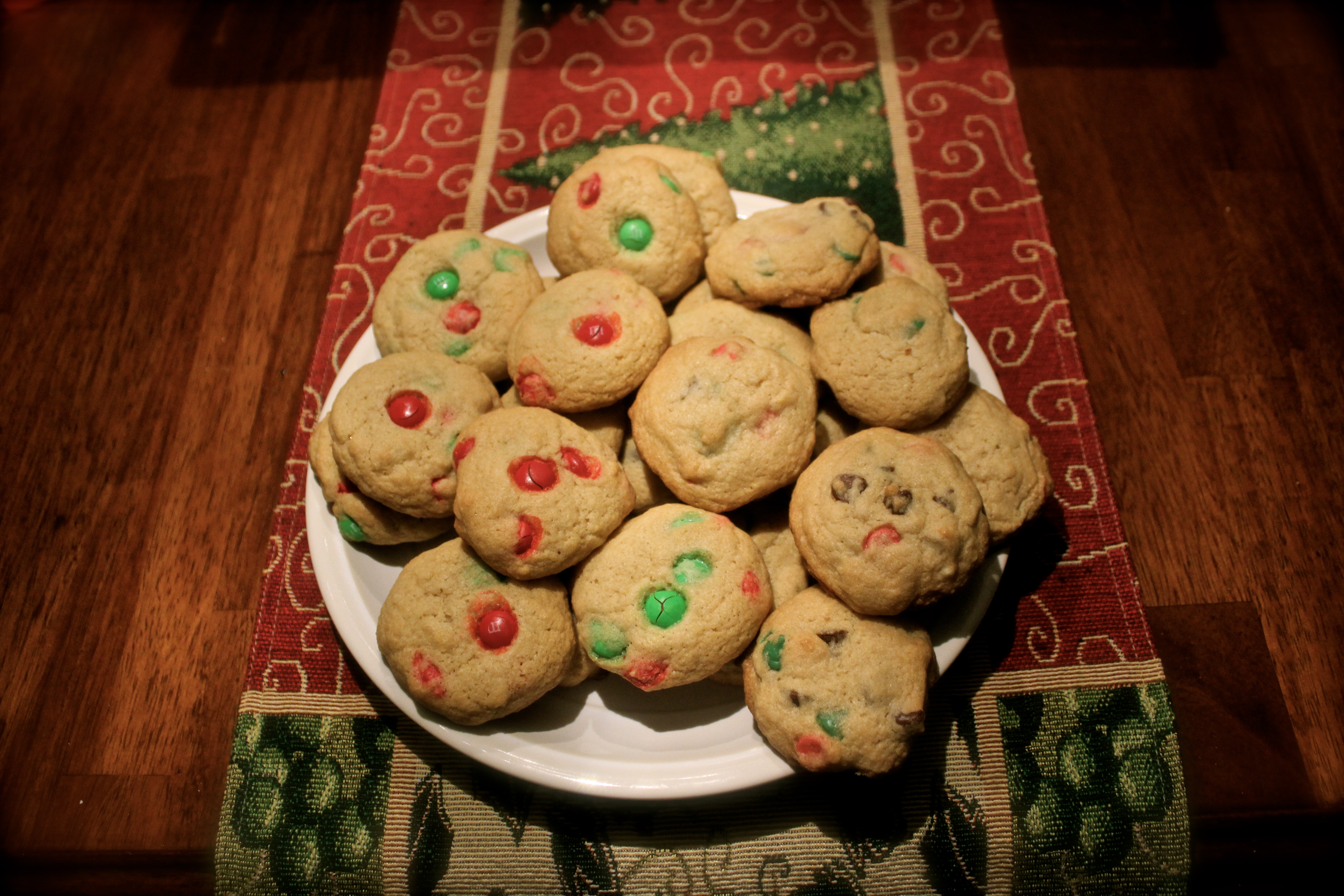 December 13: Bake Christmas cookies! Normally we do the whole Christmas-cookie-cutter-thing, but that is so messy and takes forever and they never look pretty when they are done. This year we opted for the no fail red and green chocolate chip and red and green m&m cookies.