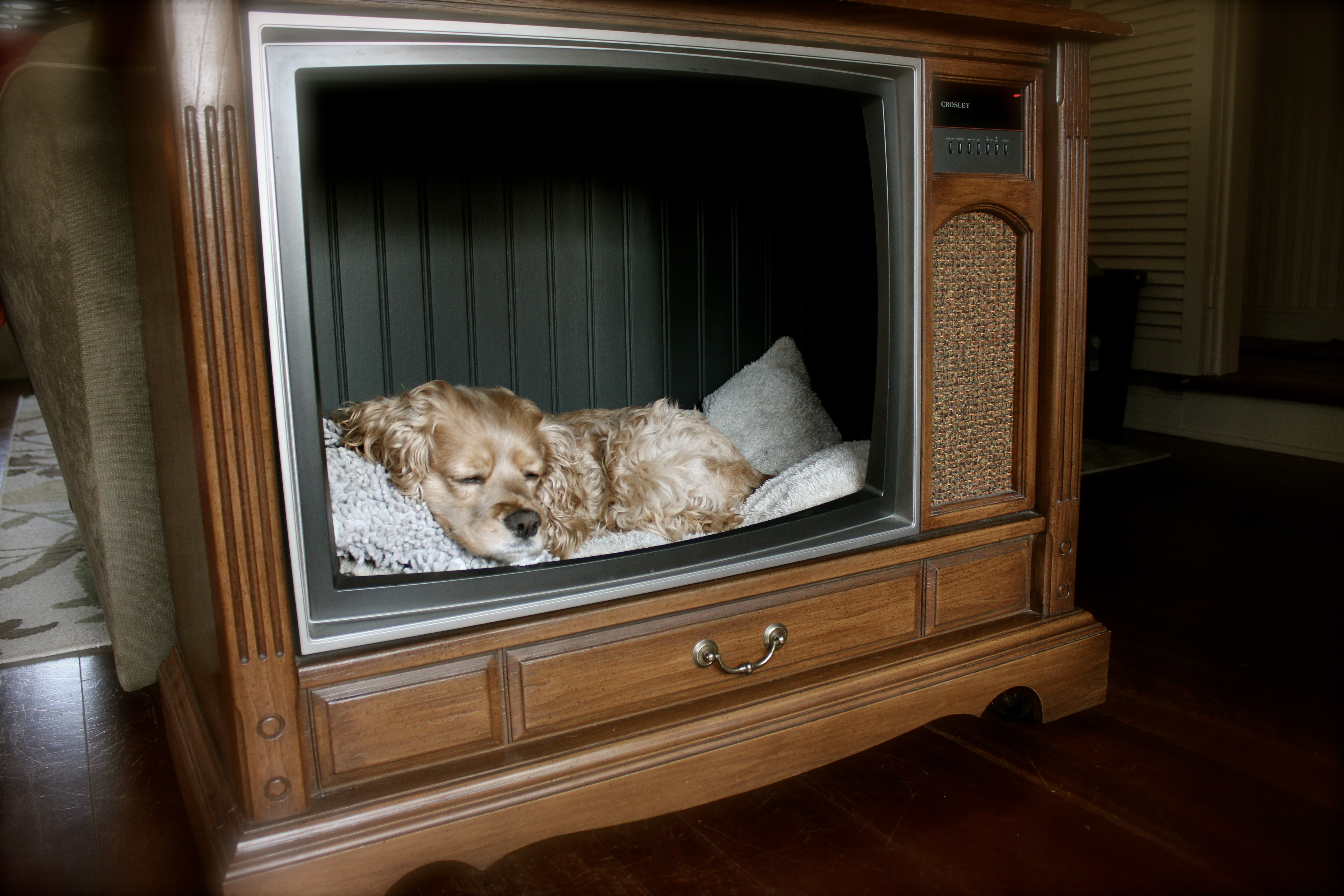 A few years ago, I saw a picture online somewhere of an old console Tv made into a dog bed. I thought it look awesome but after a few months I forgot all about it. Until a couple months ago when I was on Pinterest again and saw the same exact picture. Then I was on a mission to find an old console Tv. To my surprise, they aren’t the EASIEST things to find, especially in decent condition (if interested, start on Craigslist!)  They also come in so many styles it’s ridiculous…so it was even difficult to find one that was physically appealing to me.  So, I kind of gave up searching for a little bit.