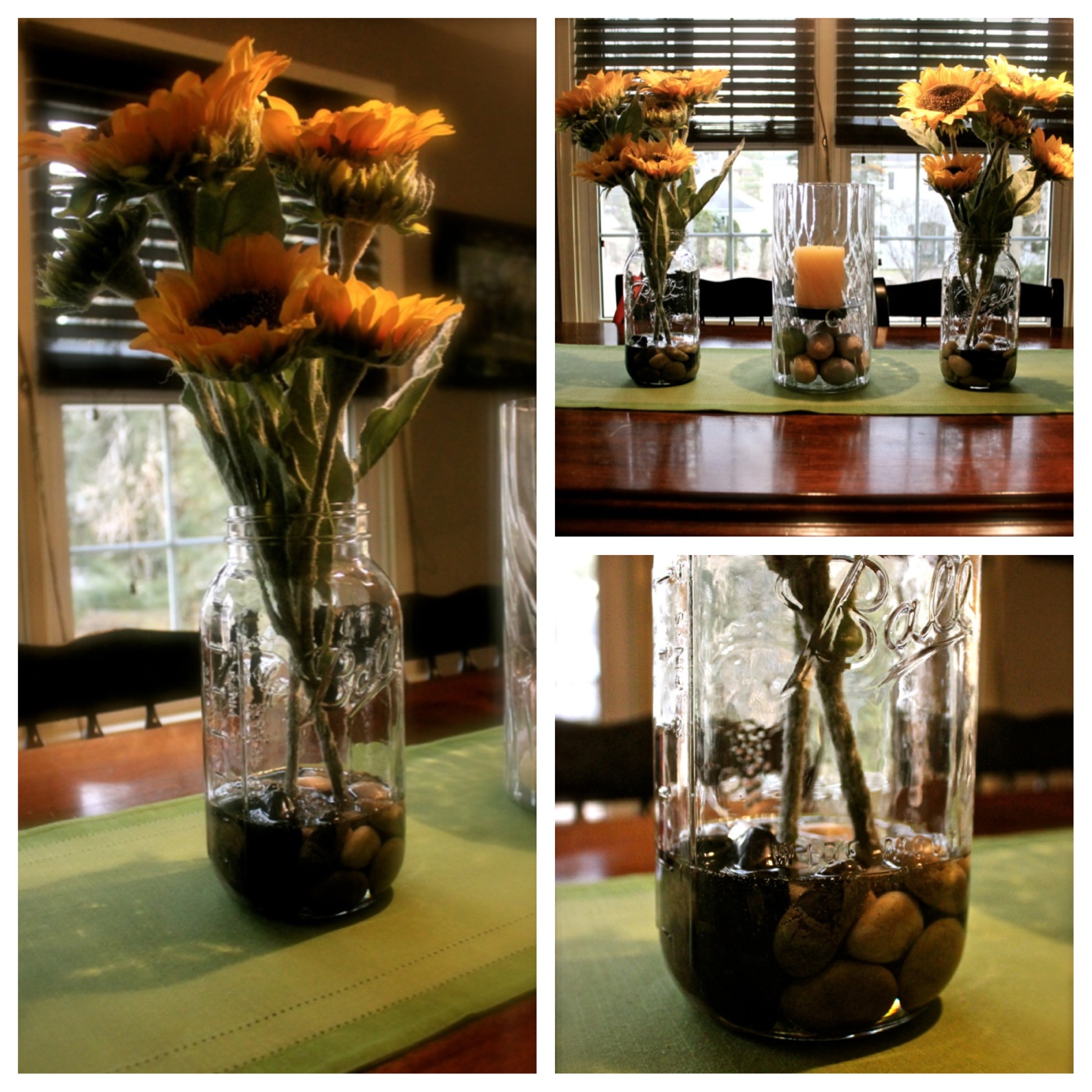 So Pete and I went to Lowes and tried to find something that would give us the look of water at the bottom of the vase. We found this stuff called Super Gloss, which was an epoxy resin. I think it was about $23. I wanted to use mason jars as my vases, and if you recall, I purchased a ton of them for $1 last year at an auction we went to. I knew they would come in handy! The next thing I needed were some rocks, which I had plenty of in the house for various candles and lanterns, and then I needed flowers. Luckily (or not so luckily, sometimes) I work right next to a Michaels. It just so happens this week, Michaels was having a sale of florals. All florals were 50% off, awesome.