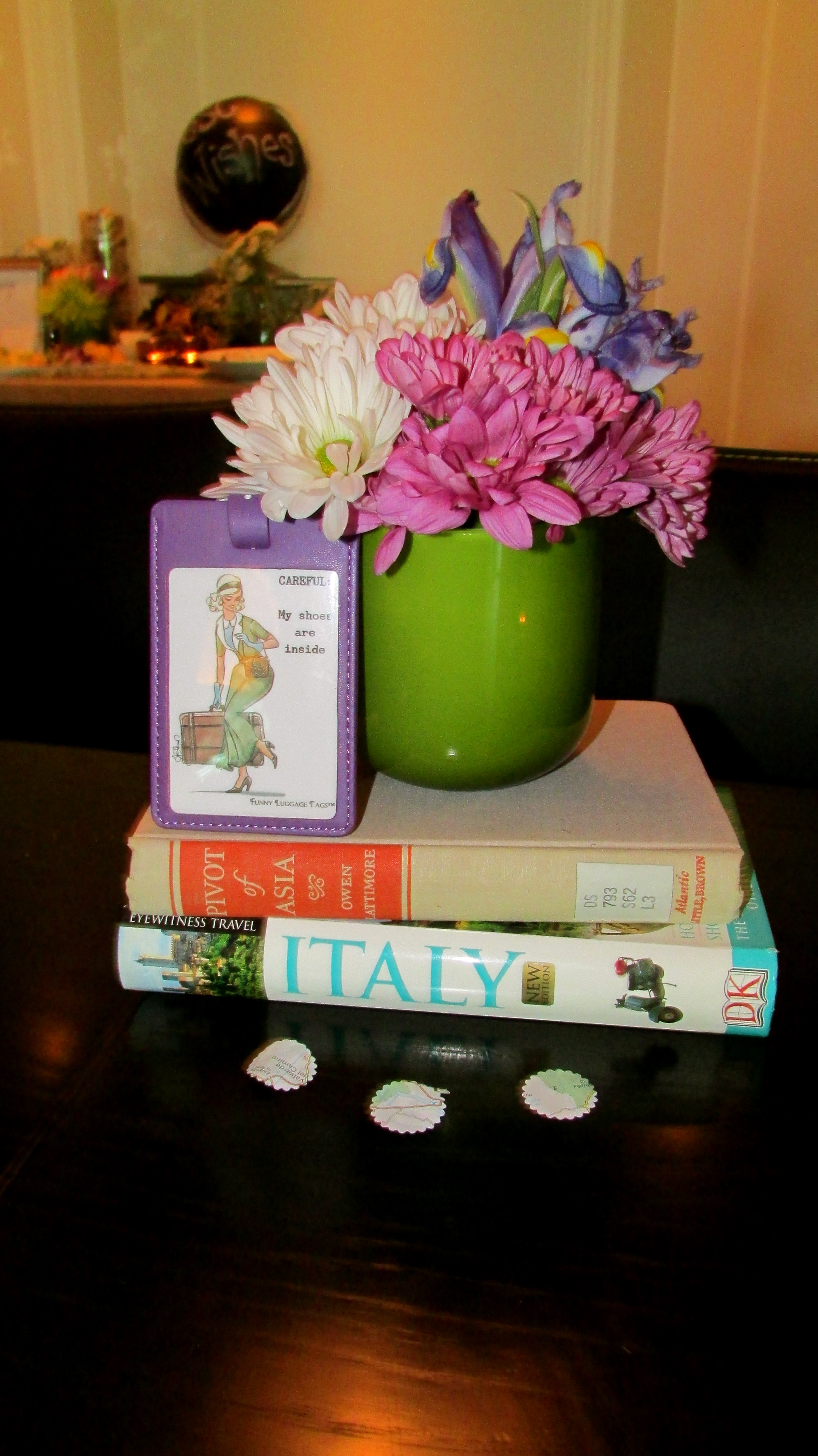 The travel theme influenced our DIY decor projects, floral arrangements and the vintage travel books that we used to spice up the private dining room.