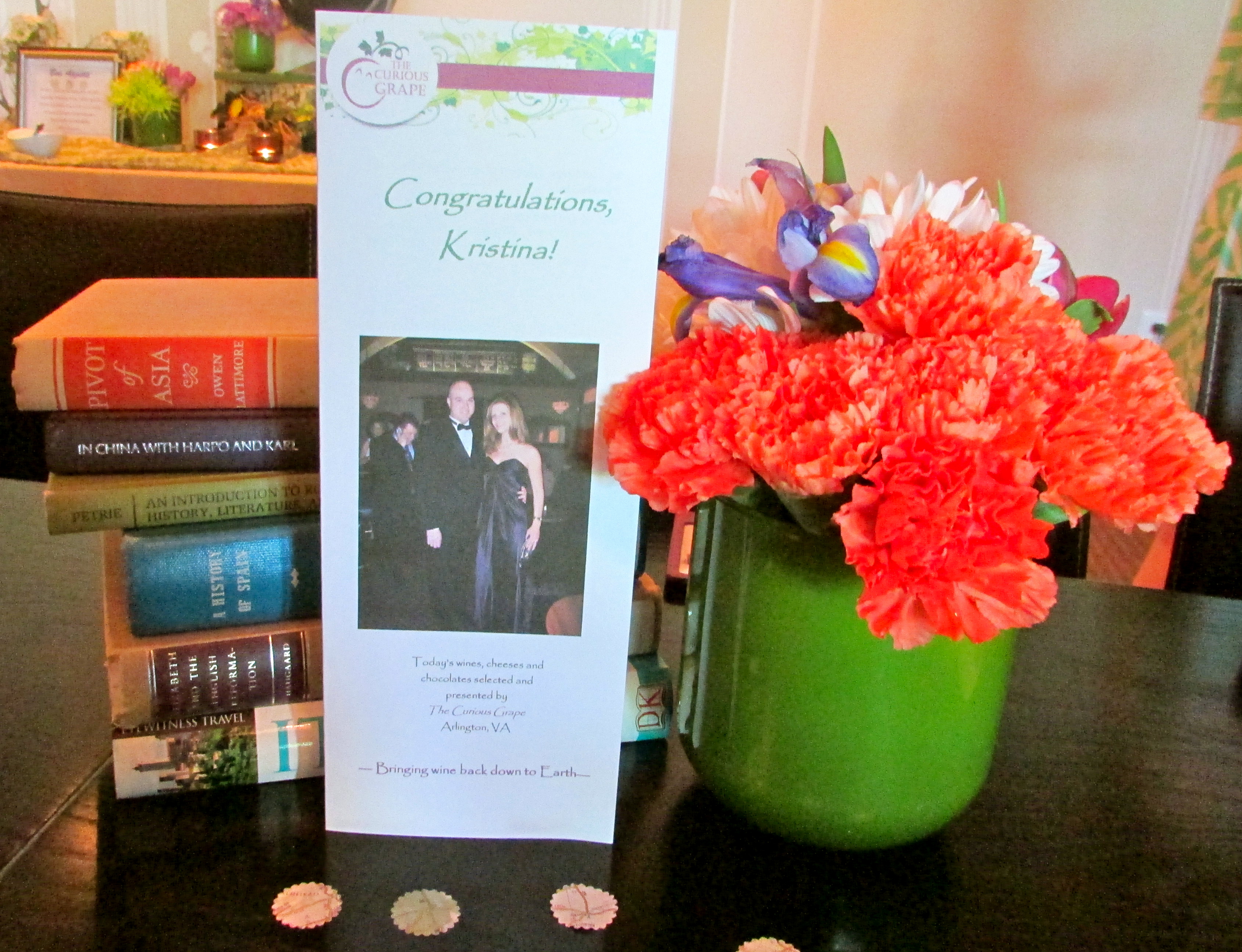 Together with Kristina’s Mother & Aunt, we hosted guests at the Curious Grape in Arlington, VA for a travel themed, wine tasting shower. We carefully crafted a unique menu & wine tasting that reflected 6 cities or regions that the bride has adventured to including Spain, New Zealand and California. The Curious Grape even found an excellent Pinot Grigio from Michigan to share with us.