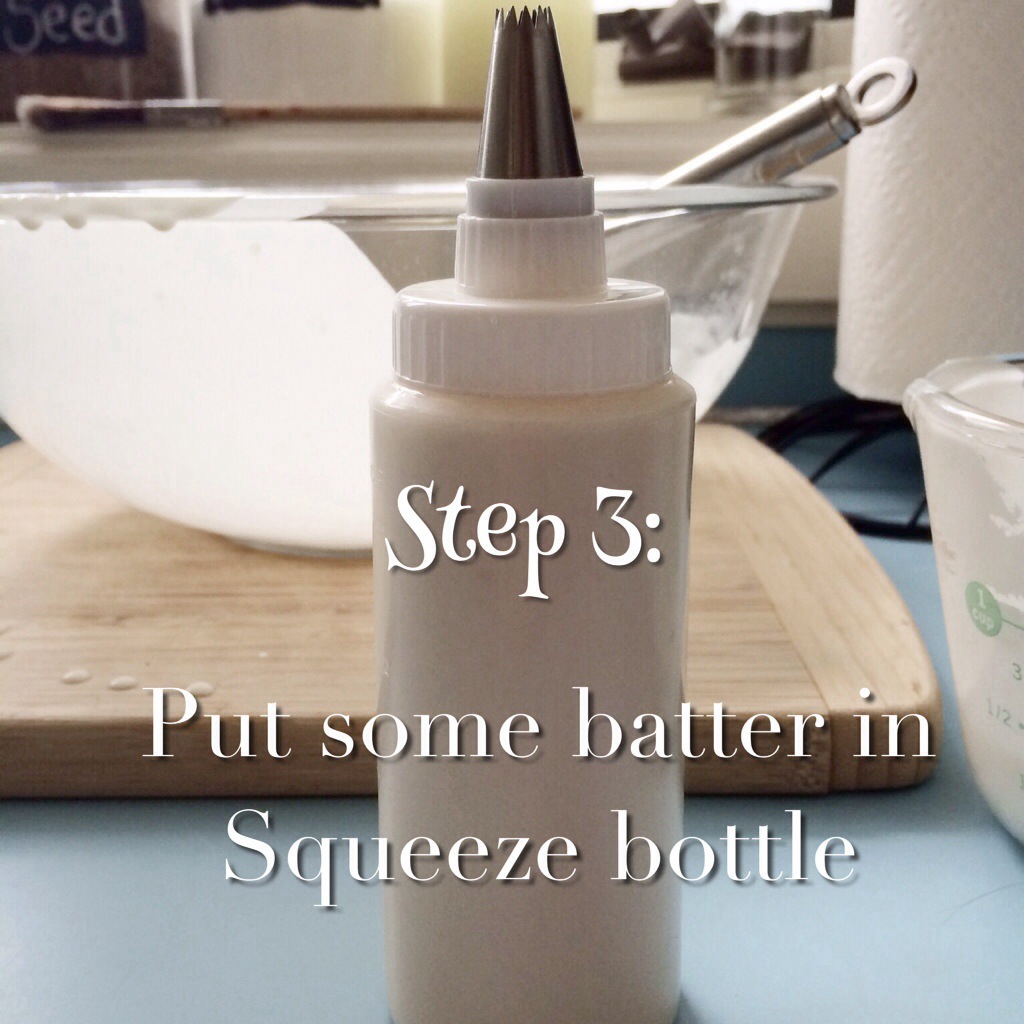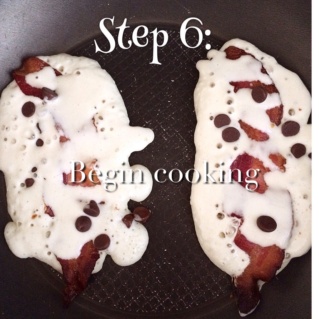 Now, you want to pour some batter in a straight line, add a strip of bacon and press gently. Take your squeeze bottle and squeeze some on top. Now, in the recipe I found they didn’t add chocolate chips. I don’t know why, I think it was a huge oversight on their part. I would suggest putting just a few on top of the batter when you pour. You don’t need too many of them.