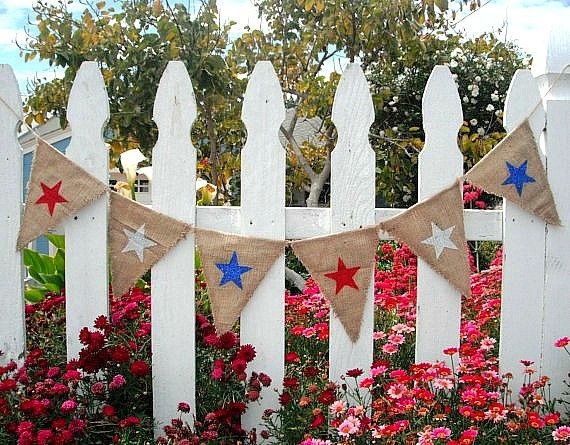 Your very own Star Spangled Burlap Banner makes for a fun display on your windows, fireplace, fence or front door. Check out my January post on DIY Burlap Penants for how-to instructions on making your own burlap penants.