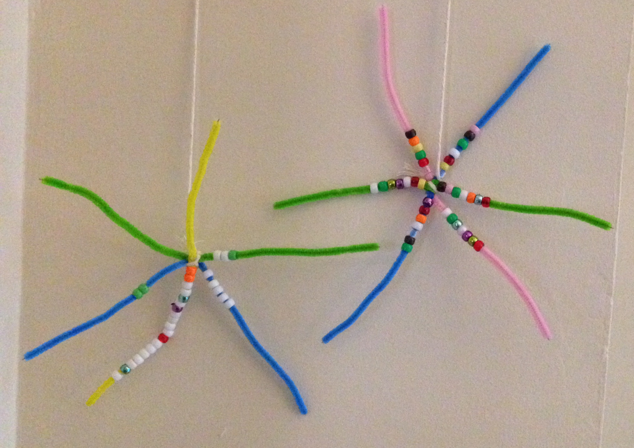 Pipe cleaner sparklers was another fun themed activity we did together. I don’t know about your kids, but mine loves beading. So we got three pipe cleaners and made a star burst shape, like an exploding firework and just added beads. Super simple, but enjoyed by all (me included!)