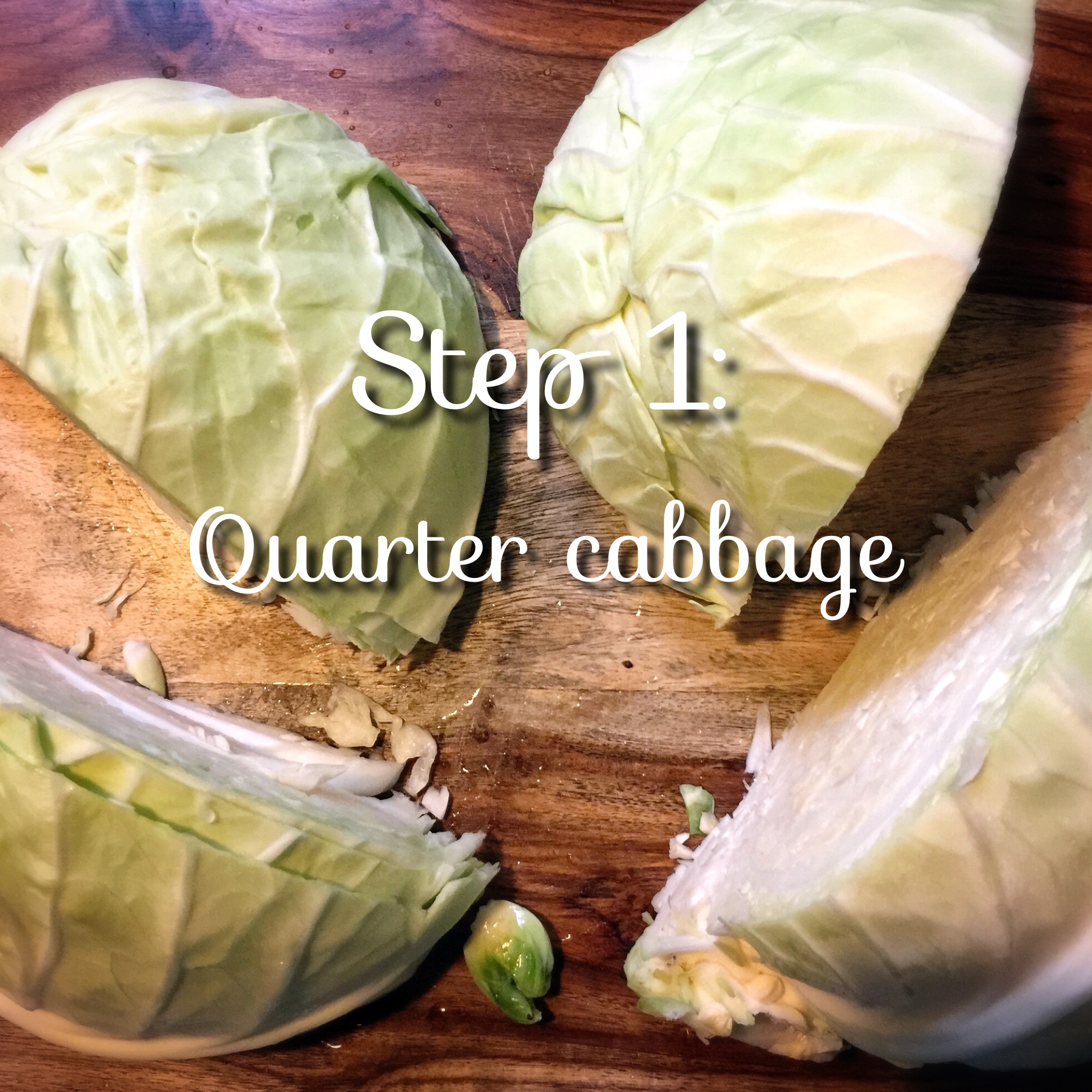 Remove the first 2-3 leaves of the cabbage and the quarter like so. Remove the tough core of the cabbage and throw away.