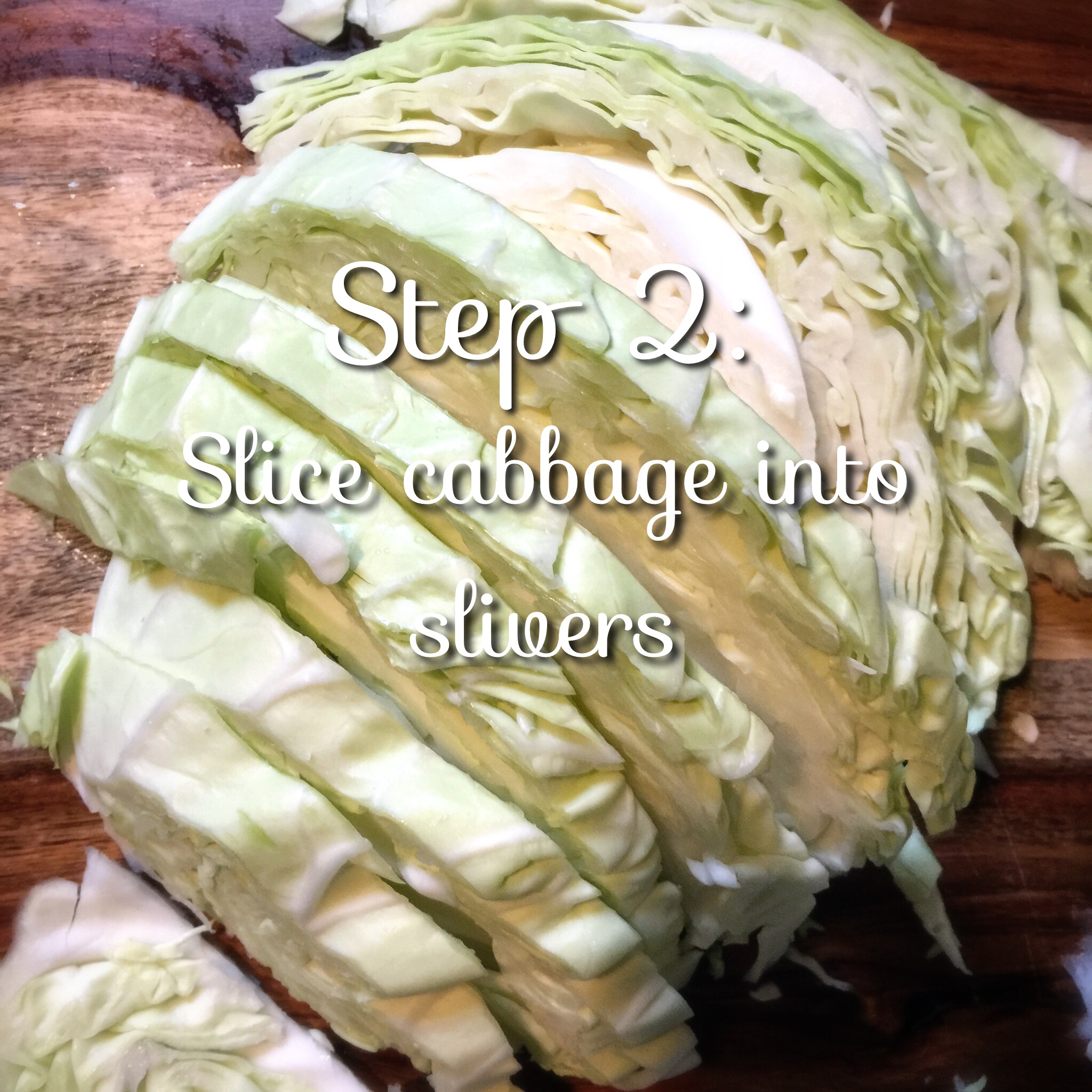 Slice each quarter of cabbage into quarter of an inch slivers. Put aside in bowl.