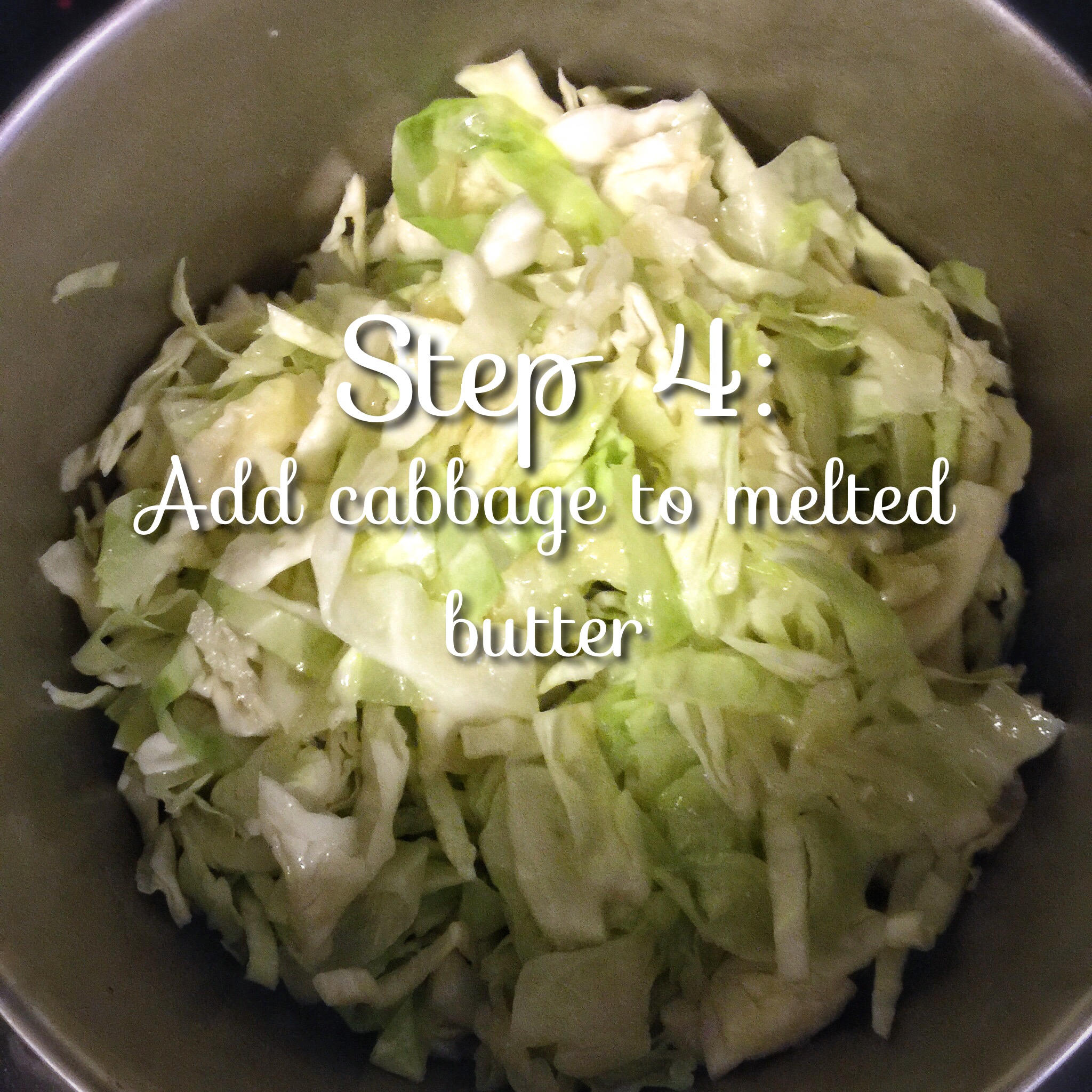 add all of your cabbage to the butter. It’s helpful to add a cup of water into the cabbage as well. Simmer the cabbage with the lid on and stir it every 10 minutes for about an hour.