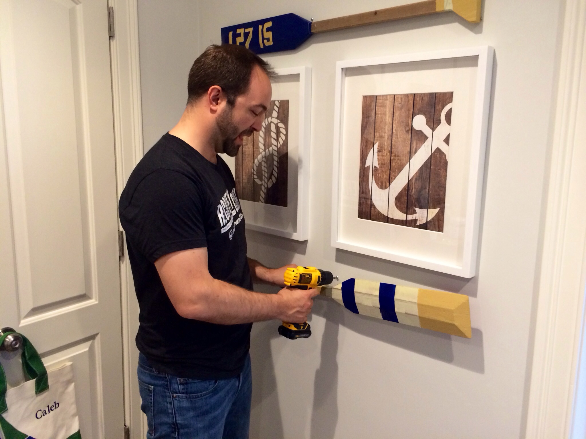 My mom owned two wooden oars that she happily contributed to our decor efforts and with a little navy and yellow paint we were able to match them to the room’s color palette. I painted Caleb’s birthdate onto one of the oars to add a personal touch. Serving as a past crew captain himself (Go Pitt Crew!), Kristian was happy to figure how to get the oars mounted.