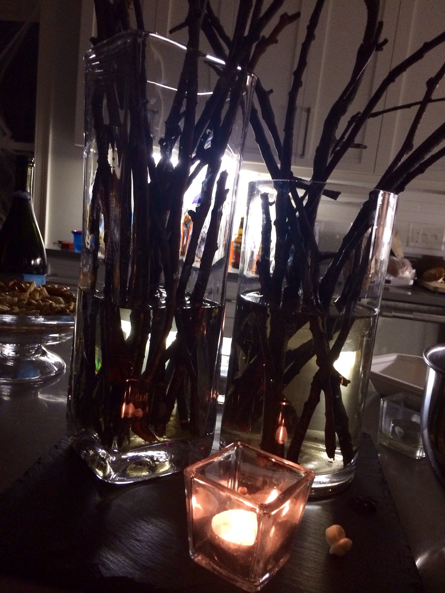 We crafted centerpieces out of gourds, pumpkins and flowers we purchased at our local super/farmers market. I also crafted creepy water wood centerpieces out of glass vases I already owned, water and sticks that I collected at the park.