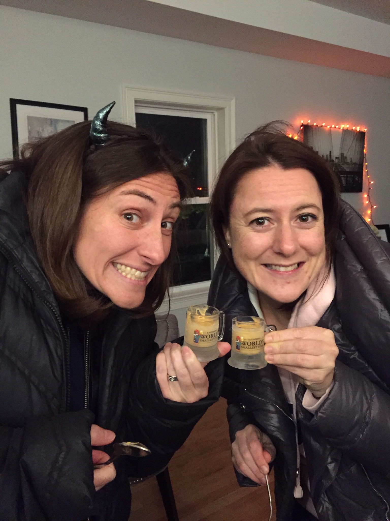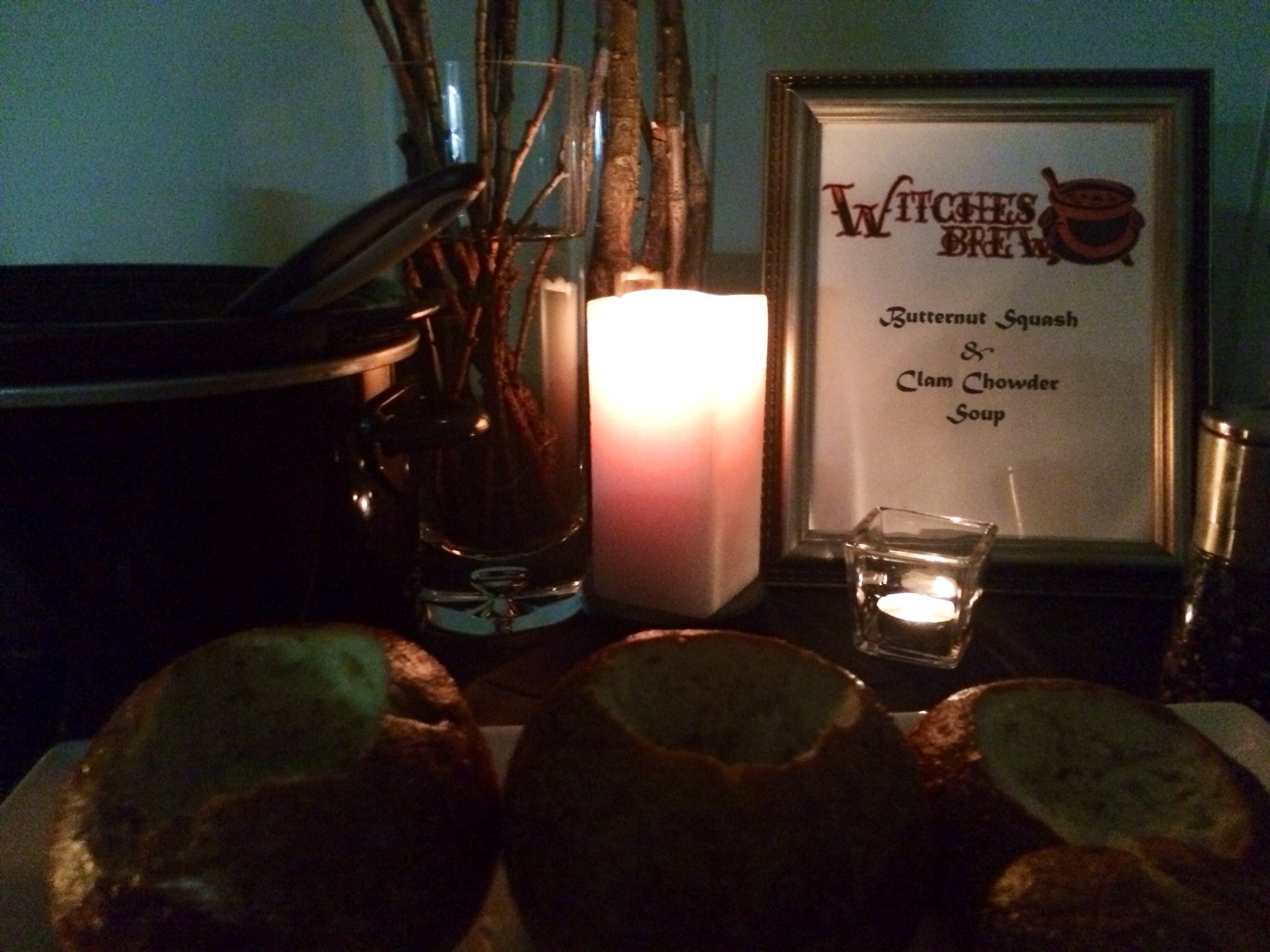 Around 7:30pm guests moved into the second floor Spider Lounge (our place) for Witches Bread Bowl Brew (aka Butternut Squash & New England Clam Chowder) and a popcorn/candy/chex mix bar. Our signature “spirit” was called Spider Cider and was crafted from Prosecco, Bourbon, Sparking Cider, honey and a touch of Cider Syrup.
